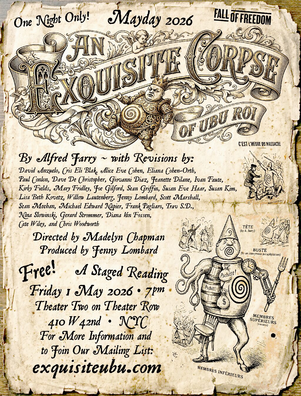 An Exquisite Corpse of Ubu Roi is a collaborative game in the form of a play. Each participating writer was given a short scene from Alfred Jarry’s 1896 proto-Surrealist masterpiece Ubu Roi to revise for our current political era. There were a few rules - the first line in each scene had to remain unchanged, no specific public figures were named, and Ubu’s famous "green candle" had to remain intact - otherwise, the writers were given free range. None of the authors involved have read or seen anyone else’s work on the play.
